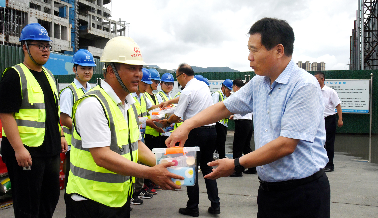 7月28日,市總工會(huì)黨組書(shū)記、副主席丁維杰帶領(lǐng)市總工會(huì)相關(guān)部門(mén)負(fù)責(zé)人一行,在集團(tuán)公司黨委副書(shū)記、工會(huì)主席戴鴻鳴的陪同下,看望慰問(wèn)奮戰(zhàn)在市重大項(xiàng)目一線(xiàn)的建設(shè)者,并送上防暑急救箱等慰問(wèn)品。 在集團(tuán)公司國(guó)際醫(yī)藥創(chuàng)新產(chǎn)業(yè)園二期項(xiàng)目工地,丁維杰與職工們親切交談,詳細(xì)了解生產(chǎn)生活情況,向頂高溫、冒酷暑,堅(jiān)守在崗位的工程項(xiàng)目建設(shè)者們致以崇高的敬意和親切的問(wèn)候,希望他們?cè)趫?jiān)守崗位的同時(shí),增強(qiáng)自我保護(hù)意識(shí),做好防暑降溫工作。同時(shí)督促建設(shè)單位要貫徹落實(shí)防暑降溫政策措施,增設(shè)防暑降溫設(shè)施,保障項(xiàng)目建設(shè)一線(xiàn)勞動(dòng)者的人身安全和身體健康。