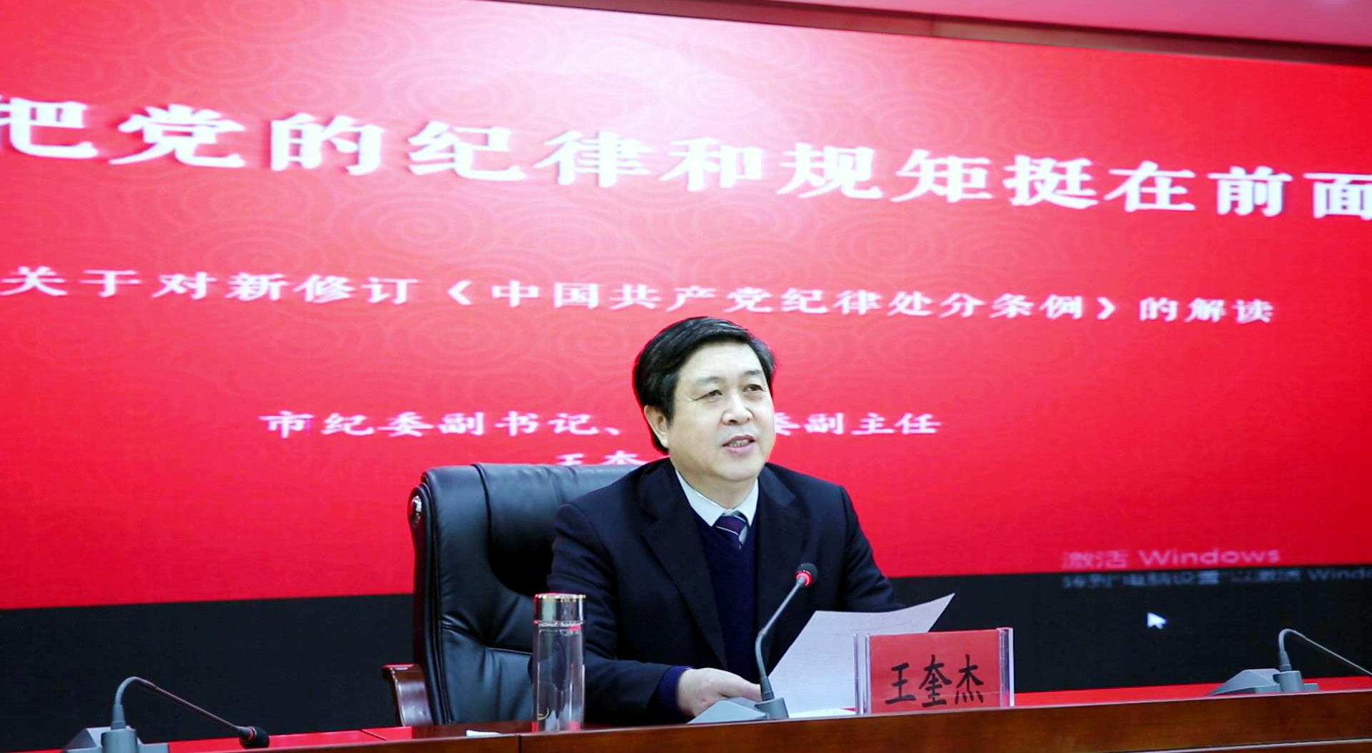 1月17日上午,集團(tuán)公司舉辦學(xué)習(xí)貫徹新修訂的《中國共產(chǎn)黨紀(jì)律處分條例》專題輔導(dǎo)報告會。邀請市紀(jì)委副書記、市監(jiān)委副主任王奎杰對新《條例》進(jìn)行輔導(dǎo)解讀,市國資委副主任許峰出席報告會。集團(tuán)公司黨委書記、董事長楊龍主持并講話。