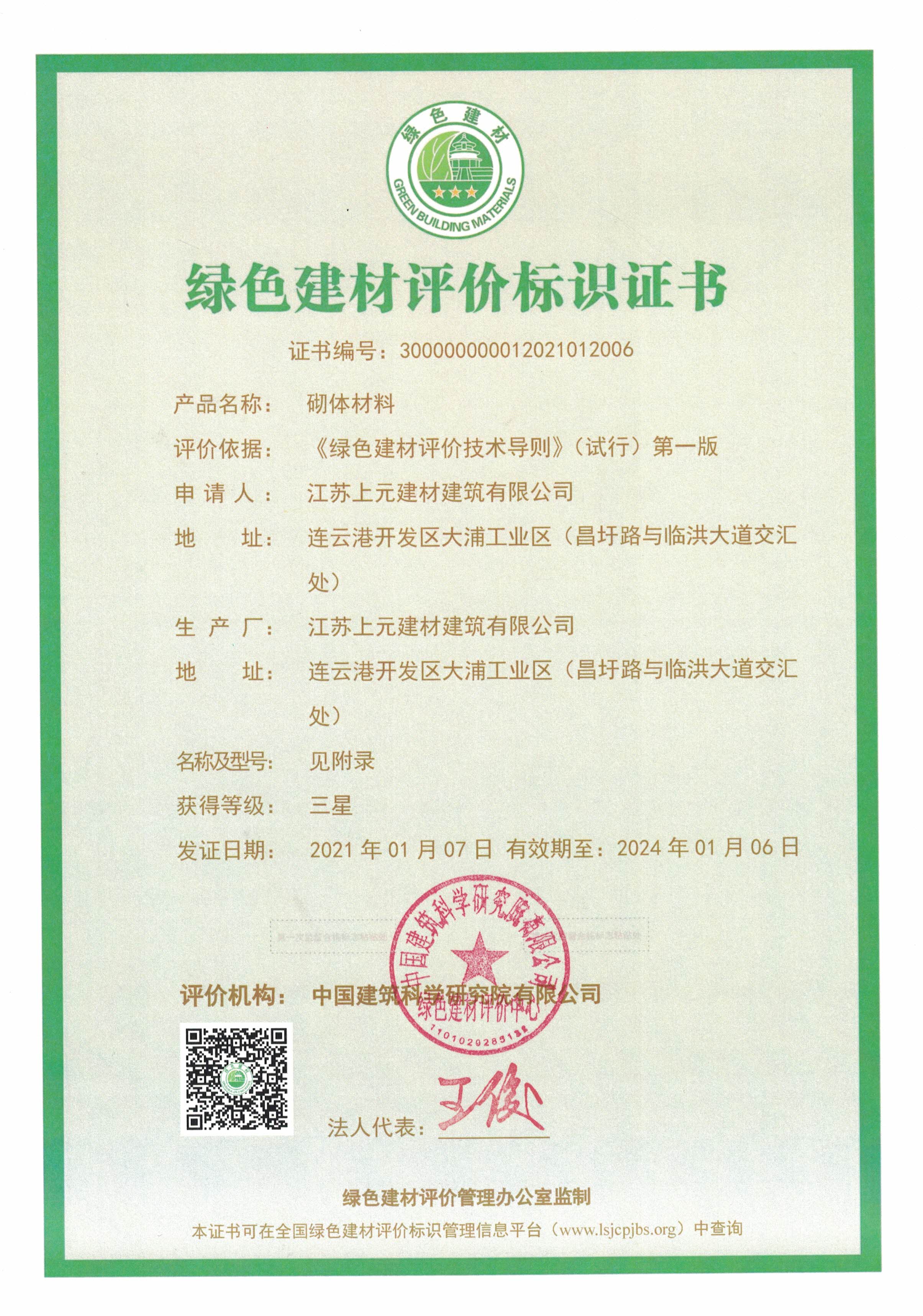 近日,房地產(chǎn)上元建材建筑公司成功獲得國家三星級(jí)綠色建材評(píng)價(jià)標(biāo)識(shí)證書,為連云港市首家獲得該項(xiàng)榮譽(yù)的蒸壓加氣混凝土板(砌塊)類企業(yè)。