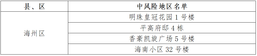 根據(jù)國務(wù)院聯(lián)防聯(lián)控機(jī)制有關(guān)規(guī)定,經(jīng)市指揮部研究決定,自發(fā)布之日起,對我市部分區(qū)域疫情風(fēng)險等級進(jìn)行調(diào)整:海州區(qū)寶泰商住樓、同科匯豐國際A5號樓、御景龍灣D6號樓、香溢世紀(jì)花城小區(qū)20號樓、馨海名郡18號樓、馨海名郡2號樓、南極南路60-1號樓由中風(fēng)險地區(qū)調(diào)整為低風(fēng)險地區(qū)。其他地區(qū)風(fēng)險等級不變。調(diào)整后全市現(xiàn)有4個中風(fēng)險地區(qū)。