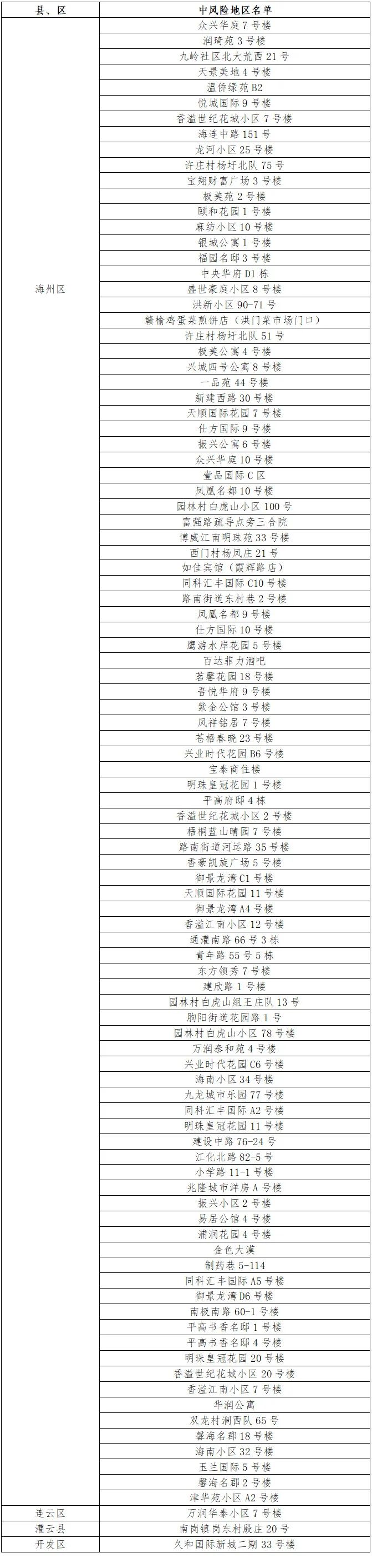 根據(jù)國務院聯(lián)防聯(lián)控機制有關規(guī)定,經綜合評估研判,市指揮部決定,自發(fā)布之日起,將海州區(qū)明珠皇冠花園20號樓、香溢世紀花城小區(qū)20號樓、香溢江南小區(qū)7號樓、華潤公寓、雙龍村澗西隊65號、馨海名郡18號樓、海南小區(qū)32號樓、玉蘭國際5號樓、馨海名郡2號樓、津華苑小區(qū)A2號樓調整為中風險地區(qū)。 其他地區(qū)風險等級不變。調整后全市現(xiàn)有99個中風險地區(qū)。 連云港市突發(fā)新冠肺炎疫情 應急處置指揮部辦公室 2022年3月14日 連云港市中風險地區(qū)(99個) (2022年3月14日)