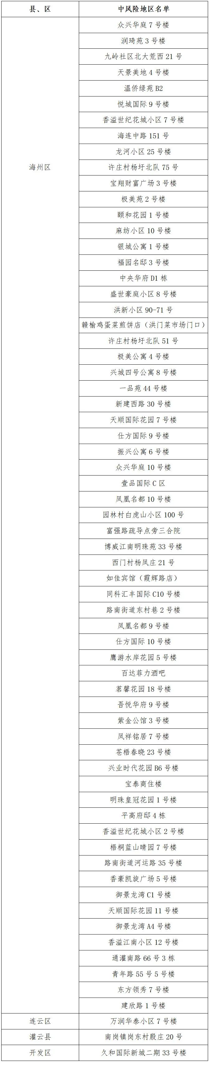 根據(jù)國務(wù)院聯(lián)防聯(lián)控機制有關(guān)規(guī)定,經(jīng)綜合評估研判,市指揮部決定,自發(fā)布之日起,將海州區(qū)茗馨花園18號樓、吾悅?cè)A府9號樓、紫金公館3號樓、鳳祥銘居7號樓、蒼梧春曉23號樓、興業(yè)時代花園B6號樓、寶泰商住樓、明珠皇冠花園1號樓、平高府邸4棟、香溢世紀(jì)花城小區(qū)2號樓、梧桐藍(lán)山晴園7號樓、路南街道河運路35號樓、香豪凱旋廣場5號樓、御景龍灣C1號樓、天順國際花園11號樓、御景龍灣A4號樓、香溢江南小區(qū)12號樓、通灌南路66號3棟、青年路55號5號樓、東方領(lǐng)秀7號樓、建欣路1號樓調(diào)整為中風(fēng)險地區(qū)。其他地區(qū)風(fēng)險等級不變。調(diào)整后全市現(xiàn)有66個中風(fēng)險地區(qū)。