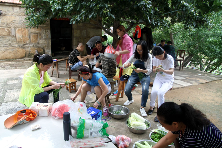 這處清幽潔凈的農(nóng)家小院成了隊員大展廚藝的用武之地,大家迅速整理好自帶的蔬菜食物,按各自特長分好工。有清理蔬菜的、有和面的、有刷鍋燒水的,那些實在幫不上忙的便湊到一起圍坐在院中的樹蔭下開始“摜蛋”比賽。廚房中,面對農(nóng)戶家中的那兩口大草鍋,負(fù)責(zé)炒菜的隊員直撓頭,因為在城里實在是無處尋覓這樣的鍋灶了,更不知該如何才能把這灶火燒得旺旺的。這時我們的女隊員劉惠自告奮勇,勇敢地?fù)?dān)起了“伙頭軍”的重任。還別說,在經(jīng)過戶主老大爺?shù)囊环更c后,一會兒功夫這灶火便被她燒得有規(guī)有距起來。很快,灶房便飄出了炒肉、煎蛋的香味。此時,院中也已擺起了包旱餃的陣式來了。面已和好,兩種口味的餡料也已備好。有負(fù)責(zé)搟餃子皮的,有負(fù)責(zé)包餃子的,隊員們賽速度、賽質(zhì)量,兩種口味的餃子被分別擺放在各自的簸箕里??粗螒B(tài)各異的餃子,大家忍不住評價起來,最終有隊員被冠上了“專業(yè)面點師”的雅號。人多力量大,當(dāng)所有的菜肴、面點擺到長桌上時,大家開心不已,雖然這算不上美味佳肴,但自己的勞動果實卻總是最美味。