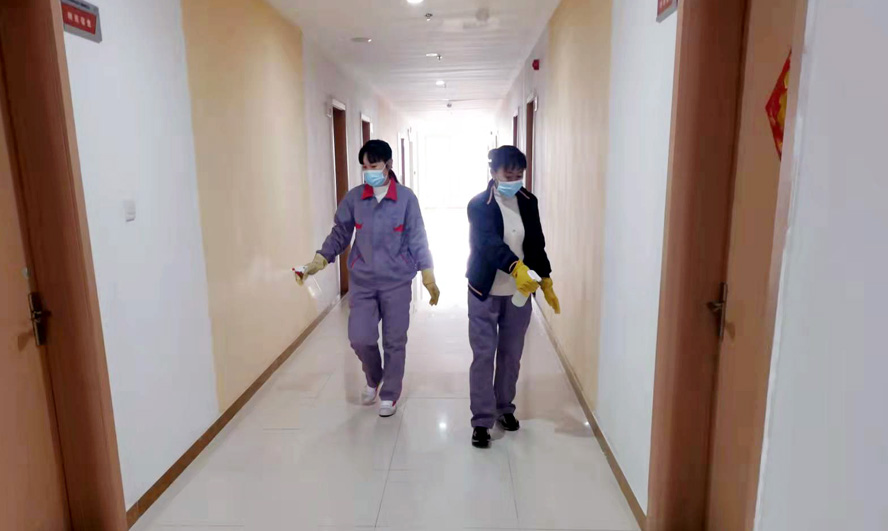 干凈整潔的辦公樓、宿舍樓里飄著淡淡的消毒水味道,清瘦干練的保潔員任禮勤正在仔細(xì)地打掃著樓道。5號(hào)疫情突發(fā)之時(shí)她正好當(dāng)班,根據(jù)以往疫情經(jīng)驗(yàn),她果斷地把一直照料著的年邁母親安排給了大哥,此后便堅(jiān)守在工作崗位上。疫情防控期間的工作量增加了不少,每天她和同事們分片作業(yè),在認(rèn)真做好各自清潔區(qū)每日兩次的保潔、消毒工作的同時(shí),還要負(fù)責(zé)就餐人員一日三餐的登記、測(cè)量體溫等工作。每天從早上7點(diǎn)開(kāi)始,5位保潔員的身影便忙碌在公司的門(mén)廳、餐廳、樓道、電梯等場(chǎng)所,這一忙常常要到晚上6點(diǎn)多?!罢?qǐng)您量下體溫”“今天你做核檢了嗎”,這些溫馨的話語(yǔ)幾乎成了她們對(duì)大家的問(wèn)候語(yǔ)。