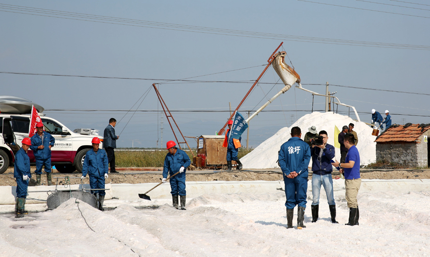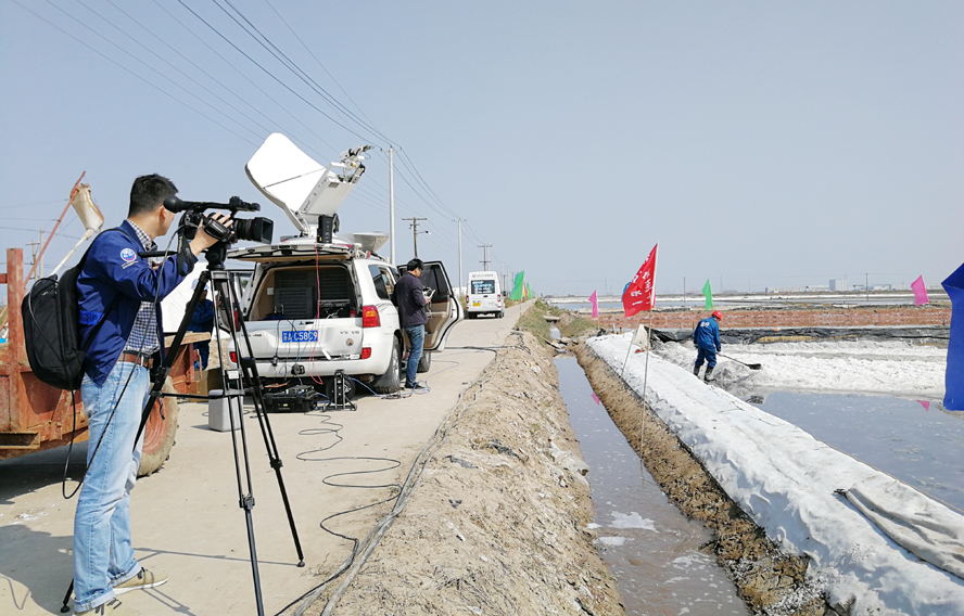 攝制組動用直播車、航拍、信號傳輸+高清攝像機(jī)等設(shè)備,工作人員各有分工,同步拍攝鹽田生產(chǎn)、鹽工勞動以及食鹽生產(chǎn)等淮鹽收獲的喜人畫面,記者更是在鏡頭的一路跟拍下,一邊自己動手操作,一邊與現(xiàn)場勞動的鹽工親切交談,向觀眾詳細(xì)解讀生態(tài)淮鹽灘曬生產(chǎn)和食鹽生產(chǎn)的工藝流程,為大家熟悉、了解和保護(hù)淮鹽提供一次直觀的認(rèn)知機(jī)會。