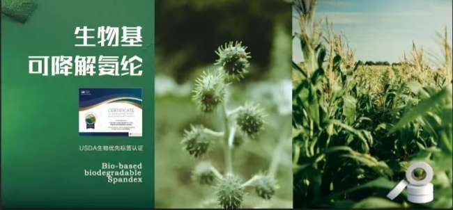 公司以蓖麻油和玉米秸稈為原料,開發(fā)出生物基可降解氨綸,其生物碳含量最高可達 75%,獲得美國農(nóng)業(yè)部 (USDA)生物優(yōu)先標(biāo)簽認(rèn)證,產(chǎn)品具有生物可降解性能,在 75 天內(nèi)生物降解率可達到 11%,產(chǎn)品生產(chǎn)過程對環(huán)境環(huán)境影響小,根據(jù)SGS對產(chǎn)品全生命周期評估,生物基可降解氨綸相對常規(guī)氨綸產(chǎn)品可以減少50%的碳排放,此外,產(chǎn)品具備優(yōu)異的酸性可染功能和耐氯功能。