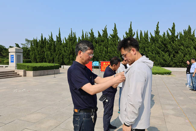 烈士陵園內(nèi),黨員在烈日下肅穆佇立,向黨旗莊嚴(yán)宣誓。新發(fā)展的8名新黨員由黨齡長、作風(fēng)好的老黨員為其佩戴黨徽,目之所及是薪火相傳的光芒。在參觀烈士詩抄碑、烈士紀(jì)念碑、烈士墓區(qū)、烈士事跡陳列館后,廣大黨員以簡樸真誠的方式,向革命先烈表達(dá)深切懷念和崇高敬意。