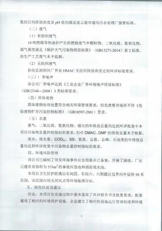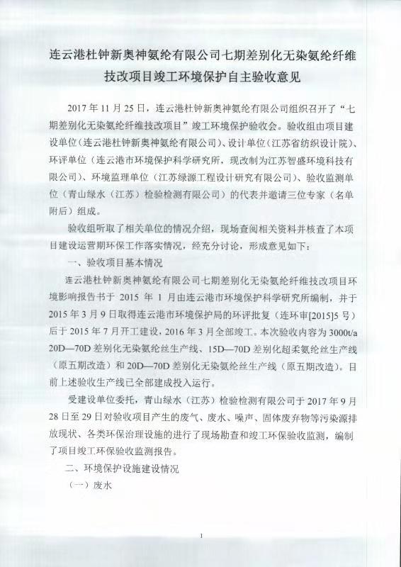 七期差別化無染氨綸纖維技改項目竣工環(huán)境保護(hù)自主驗收意見