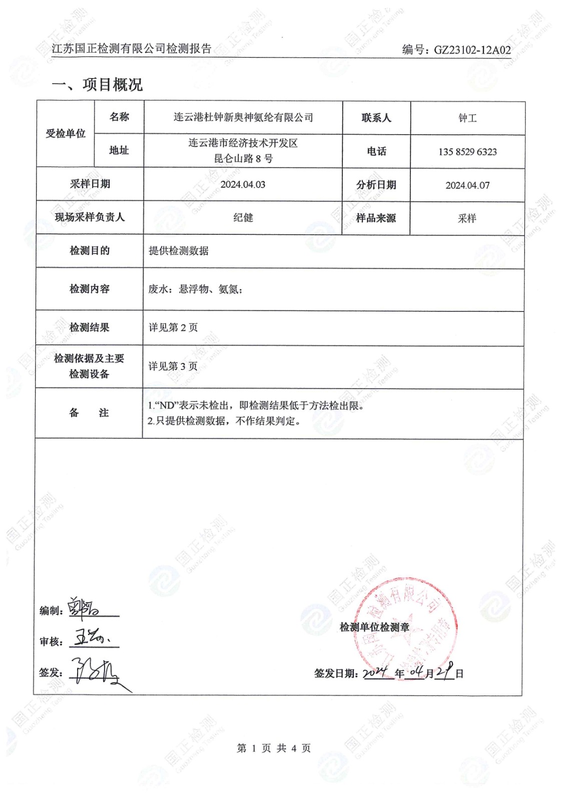 杜鐘氨綸2024年4月檢測(cè)報(bào)告