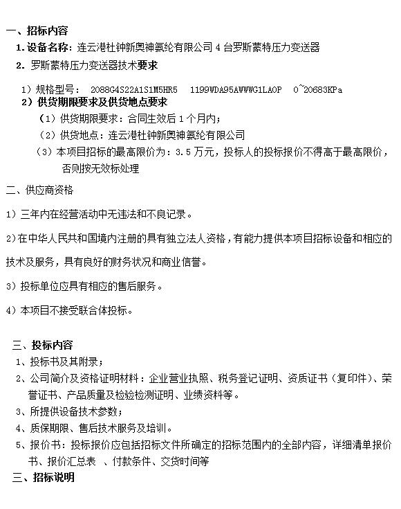 壓力變送器招標公告