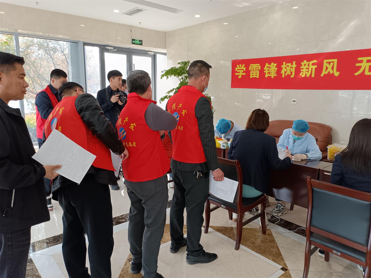 參加無償獻血的志愿者早早就來到了獻血地點,熱情洋溢而又井然有序地排隊,等候醫(yī)生給獻血者檢查血壓、脈搏和詢問相關信息。檢查通過后,獻血者依次進入獻血進行獻血。