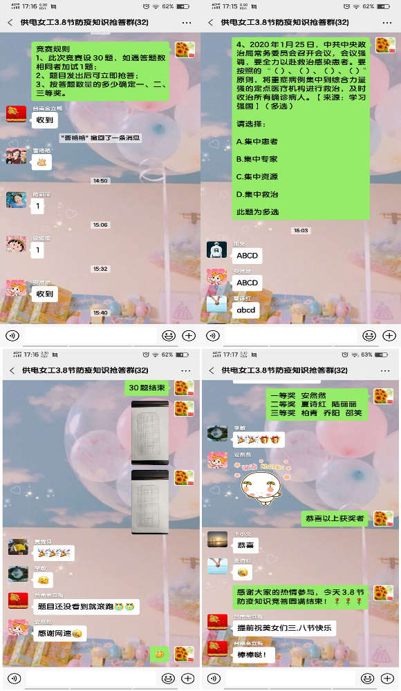“準(zhǔn)備好了么,搶答馬上開(kāi)始了。”3月6日下午4點(diǎn)整,女職工們或面對(duì)電腦或手持手機(jī),為搶答賽做著準(zhǔn)備。隨著搶答賽的開(kāi)始,在一題又一題的搶答中,雖然隔著網(wǎng)絡(luò),但是大家答題的激烈、緊張的氣氛好似都要穿透手機(jī)和電腦溢出屏幕。隨著三十道搶答題的結(jié)束,根據(jù)參賽職工的搶答速度與正確率最終決出了一、二、三等獎(jiǎng)。眾志成城防疫情,春意濃濃慶三八,線(xiàn)上網(wǎng)絡(luò)答題點(diǎn)燃了女職工們濃濃的節(jié)日氛圍。(電工)