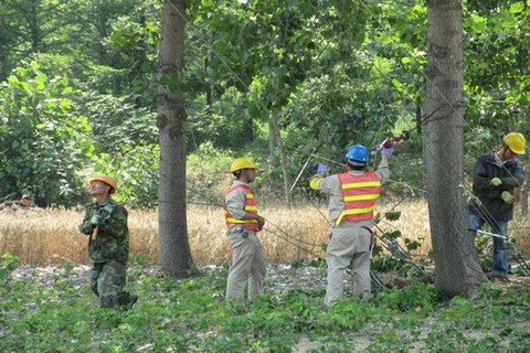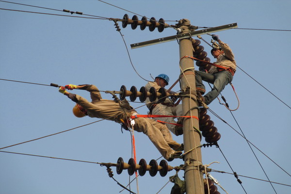 該工程本需停電施工2天,為盡可能地縮短施工停電時間、方便用戶,公司事前多次組織人員現(xiàn)場勘察論證,編制施工方案,召開施工專題會議,提前到現(xiàn)場進行技術(shù)交底。施工當(dāng)天,公司組織灌西、徐圩、臺北、臺南、青口等五個供電所150職工,參與大會戰(zhàn);清晨天剛放亮,公司領(lǐng)導(dǎo)和參戰(zhàn)職工就已趕到施工現(xiàn)場。 施工現(xiàn)場地形復(fù)雜,跨越路口8處、河線4處、通訊線光纜5處、10KV和0.4KV帶電線路7處,蝦塘10處。公司統(tǒng)一調(diào)度,分工協(xié)作,同步展開。在施工現(xiàn)場,指定了專職安全員,各道路、線路跨越處搭設(shè)了防護架,設(shè)置了臨時警示牌和警示欄,收緊線過程中進行巡線,確保施工安全。中午,公司在淮鹽大酒店制作工作簡餐,送到工地,施工人員抽空輪流進餐后,就繼續(xù)接著施工,并一直忙到晚上9點。