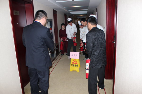 在演練時(shí),在接到報(bào)警電話的第一時(shí)間內(nèi),總經(jīng)理迅速的趕到消防控制室,統(tǒng)一指揮大家有序進(jìn)行安全疏散和逃生,客房以及餐廳的員工分頭進(jìn)行電話和敲門通知并帶領(lǐng)樓層客人用濕毛巾捂住口鼻、彎下身體,依據(jù)疏散路線快速、有序地下樓疏散到了大廳。各部門義務(wù)消防員在接到火警通知的第一時(shí)間內(nèi),迅速組織滅火力量趕到起火點(diǎn),用滅火器對(duì)初期火災(zāi)進(jìn)行了撲救。整個(gè)演練活動(dòng)緊張有序。