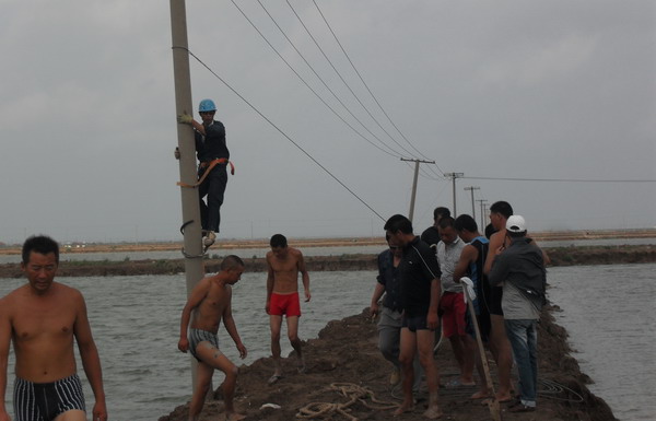 8月2日21時(shí)30分,“達(dá)維”在鹽城陳家港鎮(zhèn)登陸,帶來(lái)狂風(fēng)暴雨。所轄供電范圍比鄰陳家港鎮(zhèn),臺(tái)風(fēng)造成電力設(shè)施損壞,多條10KV線路停電。該所啟動(dòng)重大氣象災(zāi)害應(yīng)急預(yù)案,全所職工在崗待命搶修, 8月3日凌晨3時(shí)30分有全部到崗工作。4時(shí),職工分頭對(duì)線路進(jìn)行巡視檢查,在第一時(shí)間發(fā)現(xiàn)故障點(diǎn),以便搶修。該所主要領(lǐng)導(dǎo)主動(dòng)與重要客戶(hù)聯(lián)系,及時(shí)掌握情況,組織人員搶修。廣大搶修職工不怕困難,不怕疲勞連續(xù)作戰(zhàn),盡快恢復(fù)和保證生產(chǎn)生活用電,發(fā)揮了供電人特別能戰(zhàn)斗的精神。由于電桿倒在水中,給立桿帶來(lái)了困難,大家主動(dòng)脫去衣服,跳入到半腰身的水中搶修,有的解線,有的打拉線,個(gè)個(gè)干得一身汗,一身泥。