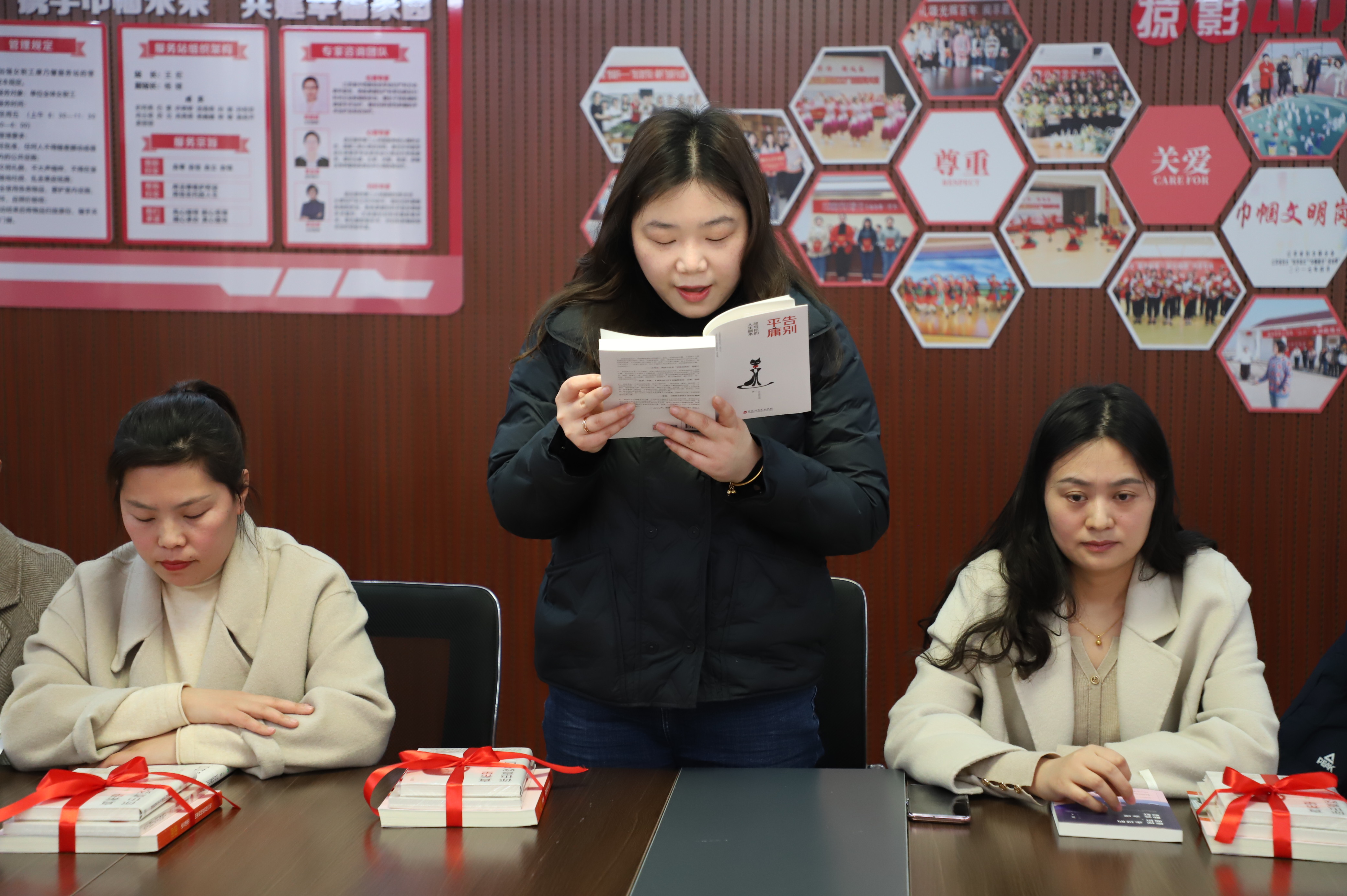 來吧,來吧,相約三八。相約在春光明媚的三月里,相約在閱讀分享的文韻里,相約在康乃馨服務(wù)站里......。3月7日下午14:00,公司工會(huì)開展的“巾幗心向黨”主題讀書分享會(huì)在女職工朗朗的誦讀中拉開帷幕。來自公司各條戰(zhàn)線上的女職工們從教育、文學(xué)、哲學(xué)、健康等方面內(nèi)容,進(jìn)一步抒發(fā)家國情懷,弘揚(yáng)時(shí)代精神,給我們帶來了一場(chǎng)聽覺盛宴。塑造知識(shí)型的“她”,并為女職工贈(zèng)送有關(guān)紅色主題、女性勵(lì)志等方面的書籍,在廣大婦女中營造“好讀書、讀好書、讀書好”的良好氛圍,促進(jìn)家庭文明、社會(huì)和諧。