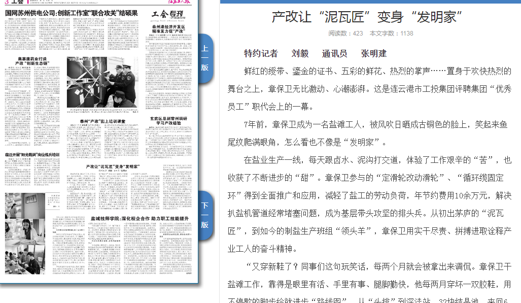 近年來(lái),連云港市工投集團(tuán)灌西公司為打通產(chǎn)業(yè)工人成長(zhǎng)成才的身份壁壘、價(jià)值體現(xiàn)壁壘及學(xué)習(xí)教育壁壘,開(kāi)辦技能培訓(xùn)“大課堂”,打造“一中心+三基地”職業(yè)教育平臺(tái),即金藍(lán)領(lǐng)技術(shù)工人培訓(xùn)中心和技能比武基地、技術(shù)創(chuàng)新基地、技能鑒定基地,構(gòu)建公司、單位和班組三級(jí)職業(yè)教育體系、技能培訓(xùn)體系和技能評(píng)定體系,引導(dǎo)產(chǎn)業(yè)工人重在技能深耕、求精、拔尖、攀高上磨練塑造。章保衛(wèi)正是在技能培訓(xùn)的“大課堂”中一步一步成長(zhǎng)起來(lái),他參與的“定時(shí)打鹵泵”、“管道輸送加壓法”、“低溫除硫工藝”等技術(shù)得到快速推廣,也讓他從普通員工成長(zhǎng)為“二星級(jí)優(yōu)秀員工”,被推選擔(dān)任制鹽生產(chǎn)班組長(zhǎng),每月工資增長(zhǎng)800元。這一切讓他獲得滿(mǎn)滿(mǎn)的榮譽(yù)感和幸福感。