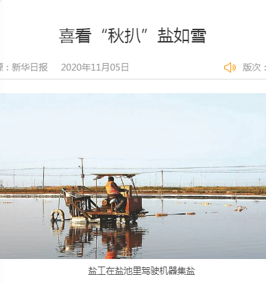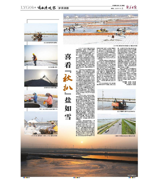 10月22日,在位于灌云縣東北角的灌西鹽場(chǎng),一名鹽工正開(kāi)著電動(dòng)履帶扒鹽機(jī)在鹽池里扒鹽。這一天,鹽場(chǎng)人簡(jiǎn)稱“秋扒”的秋季扒鹽已近尾聲。不遠(yuǎn)處,7000噸鹽堆成的鹽廩像一座小雪山,那是鹽工們一星期的勞動(dòng)成果。