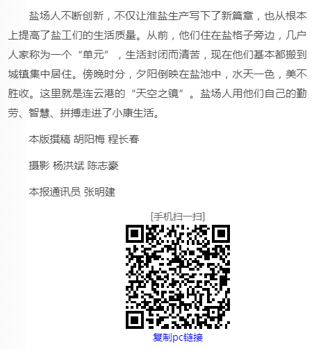 鹽場(chǎng)人不斷創(chuàng)新,不僅讓淮鹽生產(chǎn)寫(xiě)下了新篇章,也從根本上提高了鹽工們的生活質(zhì)量。從前,他們住在鹽格子旁邊,幾戶人家稱為一個(gè)“單元”,生活封閉而清苦,現(xiàn)在他們基本都搬到城鎮(zhèn)集中居住。傍晚時(shí)分,夕陽(yáng)倒映在鹽池中,水天一色,美不勝收。這里就是連云港的“天空之鏡”。鹽場(chǎng)人用他們自己的勤勞、智慧、拼搏走進(jìn)了小康生活。