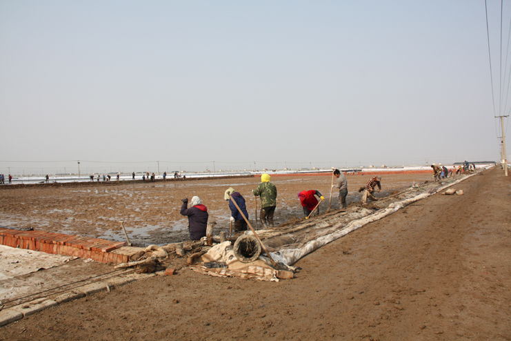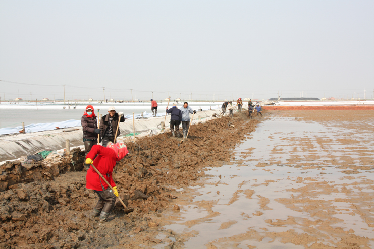 3月21日,在新河制鹽分公司八班的一期結(jié)晶區(qū),一片火熱景象,只見大家正在灘內(nèi)揮膀大干,挖泥的、和泥的、打堰的,配合密切,運作熟練,參加勞動的職工足有50余人。“為了加快食用原料海鹽基地建設(shè)進(jìn)度,今天,我們集中了7個組班的員工幫助八班維修下馬格格堰,爭取早日灌池生產(chǎn)。”正在工作現(xiàn)場安排工作的該公司經(jīng)理安樹林說道。