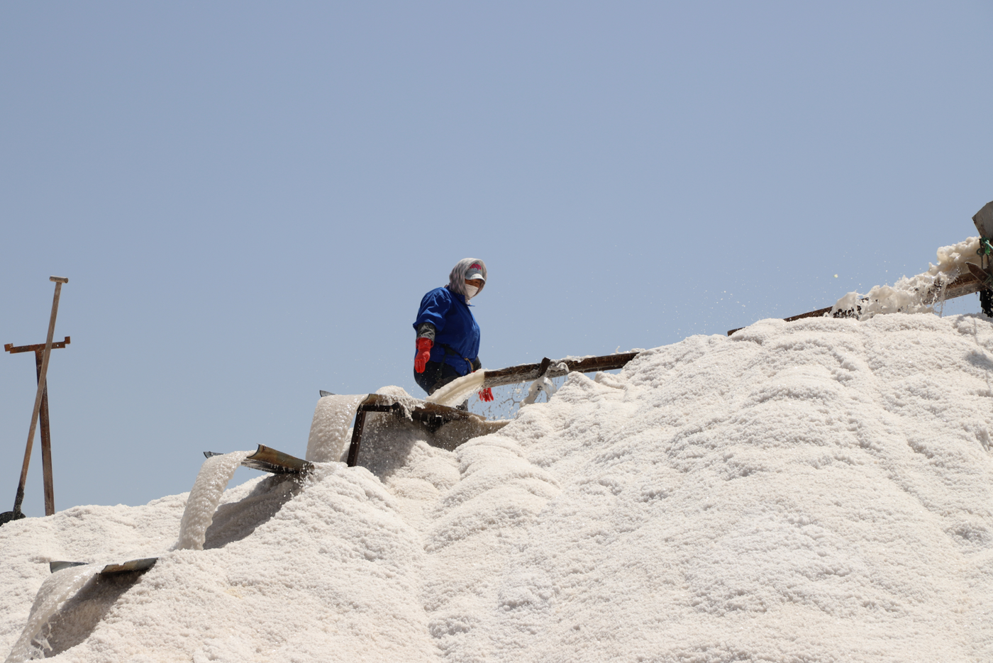 在新河十一班,扒鹽工作正在緊張的進(jìn)行之中,兩名員工在鹽廩上揮舞著木鍬,搬送著淌鹽的導(dǎo)流板做鹽廩,扒鹽員工跟時(shí)間賽跑,24小時(shí)不停機(jī)3班倒開機(jī)扒鹽,緊緊抓住當(dāng)前生產(chǎn)經(jīng)營(yíng)的黃金季節(jié),搶抓扒鹽進(jìn)度,堅(jiān)決實(shí)現(xiàn)時(shí)間任務(wù)雙過半。
