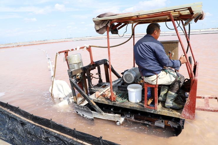 筆者在走訪時看到,在新河制鹽分公司10班的鹽池內(nèi),一臺輕型自吸式電動履帶“T30”正在進行帶鹵扒鹽,大池道上抽鹽機泵的轟鳴聲回蕩在鹽灘上,不遠處另外幾個扒鹽機組也在不停的忙碌著。