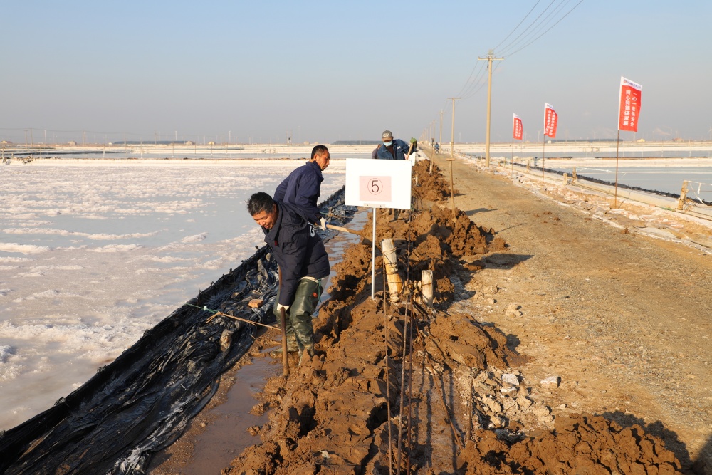 寒冬時(shí)節(jié),暖陽之下,鹽廩之旁,曬得黝黑的鹽場產(chǎn)業(yè)工人們按照競賽的考核標(biāo)準(zhǔn),做熟泥、打堰墻、做堰頂,護(hù)埝頂、夯埝坡、清塘底,見證了一場技能比拼的盛會。經(jīng)過一天的鏖戰(zhàn),潘成軍師徒取得了池堰修整第一名;董治波師徒取得了土塘清淤第一名。(西工)