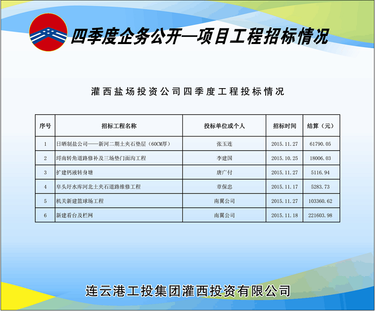 四季度灌西共開工建設(shè)6個工程項(xiàng)目,分4次由投資公司招標(biāo)領(lǐng)導(dǎo)小組采用公開邀標(biāo)形式進(jìn)行了招標(biāo)。