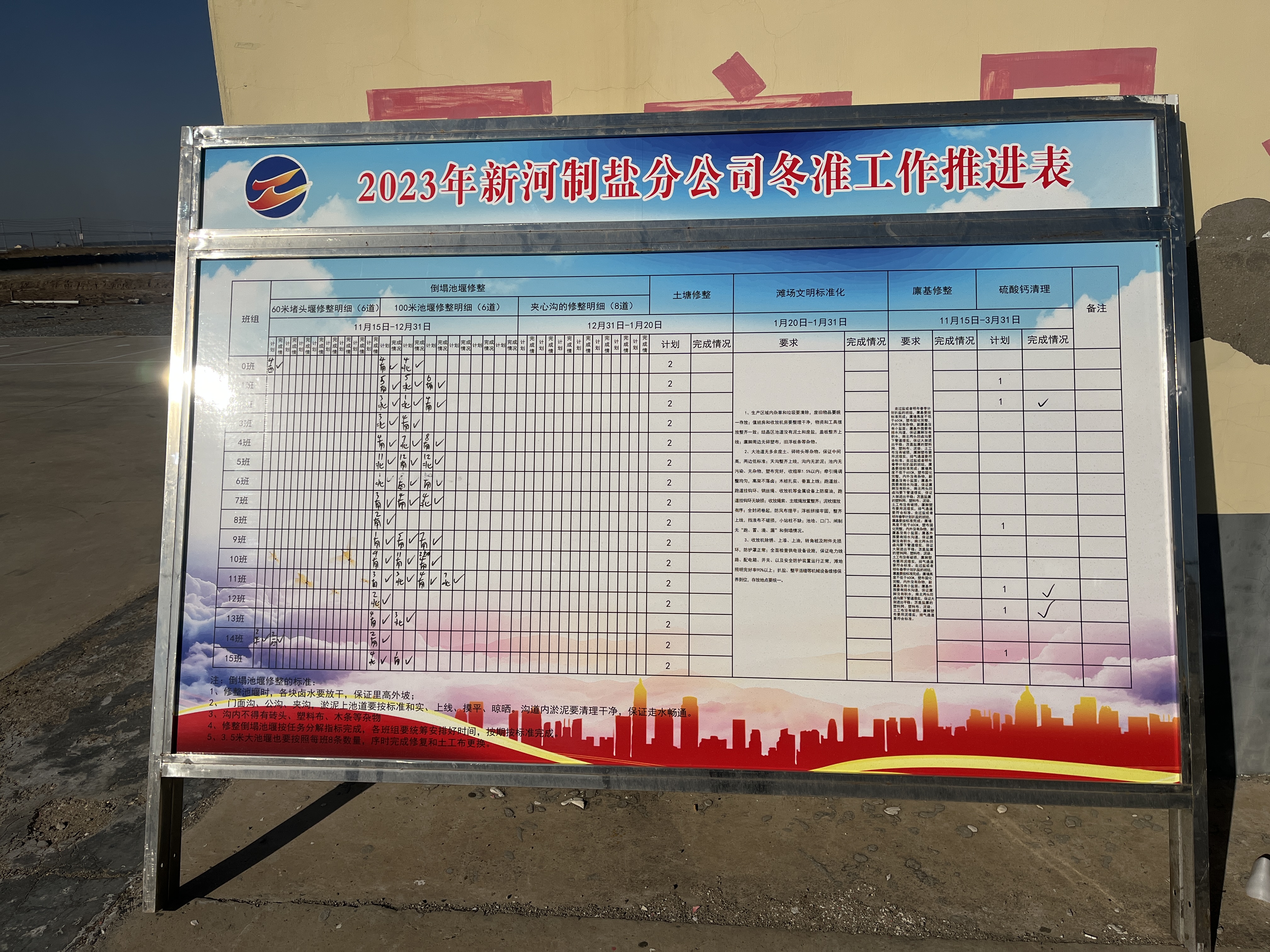 冬季是日曬制鹽收儲(chǔ)鹵水、扒土塘、整理灘場(chǎng)文明的最佳時(shí)期,也是為2024年工作起好頭、邁好步的關(guān)鍵時(shí)期,自冬準(zhǔn)工作開展以來,新河制鹽分公司制定冬準(zhǔn)工作推進(jìn)表,掛圖作戰(zhàn)按時(shí)推進(jìn)冬準(zhǔn)進(jìn)度。