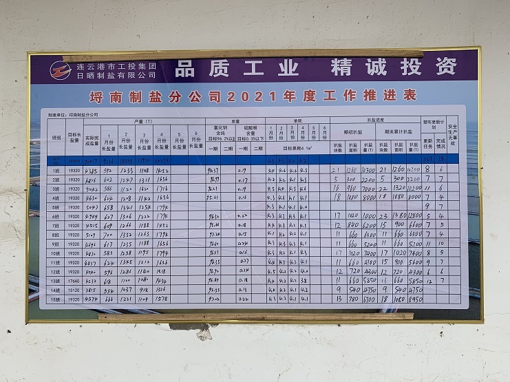 張貼二季度工作推進表,清晰的反映出目前的原鹽產(chǎn)量、質(zhì)量、單耗、以及春季扒鹽情況。分公司經(jīng)理程龍要求各個片區(qū)負責(zé)人按照表上反映的數(shù)據(jù),查漏補缺,強化生產(chǎn)工作。在提高單產(chǎn)、降低單耗上下功夫,強化“三雨操作”,加強結(jié)晶管理,嚴格除硫生產(chǎn)工藝,充分利用粉鹽化鹵,下馬格、副廩基等有效面積窮制鹵水,最大限度地降低鹵耗,提高單產(chǎn),加快扒鹽進度、強化扒鹽產(chǎn)量、保證安全工作。