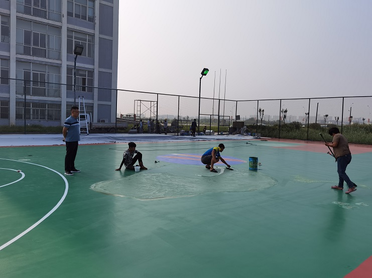 灌西籃球場總面積約510平米,附屬球場地面600平米,外圍護欄高3米。項目圍繞關(guān)鍵節(jié)點及重難點,強化施工組織,統(tǒng)籌施工進展?;@球場地面露天暴曬,溫度極高,仿佛蒸籠一般。施工人員在進行鑿地、涂漆時,僅幾分鐘的功夫,衣服從里到外被汗水浸濕,隨時有中暑的可能性,項目組把責(zé)任明確到個人,開展班前安全教育活動,保證施工安全。施工單位南翼工程公司負責(zé)人錢明偉克服人員緊缺,工期緊迫等問題,頂著高溫,始終奮戰(zhàn)在工程項目第一線。