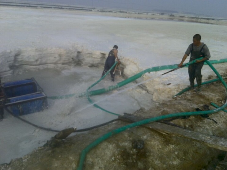 近日來(lái),連續(xù)高溫酷暑天氣對(duì)日曬制鹽員工提出了生理挑戰(zhàn),新河制鹽廣大員工直面高溫,不畏酷暑,積極做好除硫工作,保證原鹽質(zhì)量。圖為除硫現(xiàn)場(chǎng)操作手緊握高壓水槍,對(duì)硫酸鈣沉淀區(qū)進(jìn)行沖刷。(新河制鹽 邱利民)