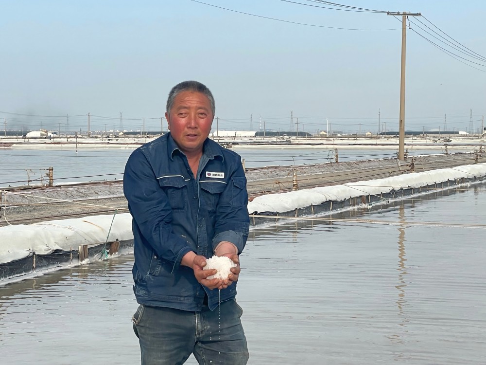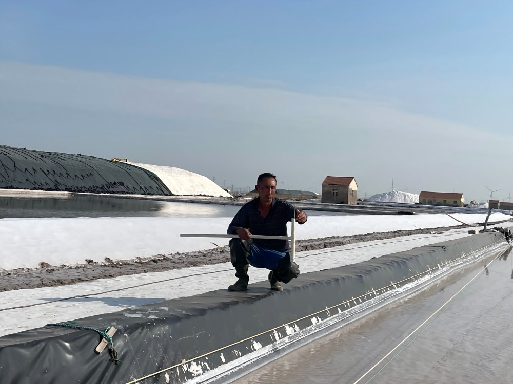 鹽工們的日常,是與陽光、礦鹵和鹽灘的對話。清晨,他們早早來到鹽灘,檢查鹵水深度和濃度,各節(jié)制、池埝是否滲漏;下午,頂著烈日觀察礦鹵蒸發(fā)狀態(tài);傍晚,仔細(xì)查看鹽粒結(jié)晶情況。遇到極端天氣,全員出動,爭分奪秒為鹽堆苫蓋防護(hù)布。“雖然辛苦,但看到像小山一樣的鹽堆,就覺得一切都值了?!蹦贻p的鹽工小陳擦著汗笑道。