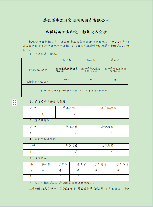 連云港市工投集團(tuán)灌西投資有限公司水稻轉(zhuǎn)運(yùn)業(yè)務(wù)擬定中標(biāo)候選人公示