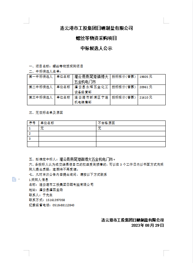 連云港市工投集團(tuán)日曬制鹽有限公司螺絲等物資采購(gòu)項(xiàng)目中標(biāo)候選人公示