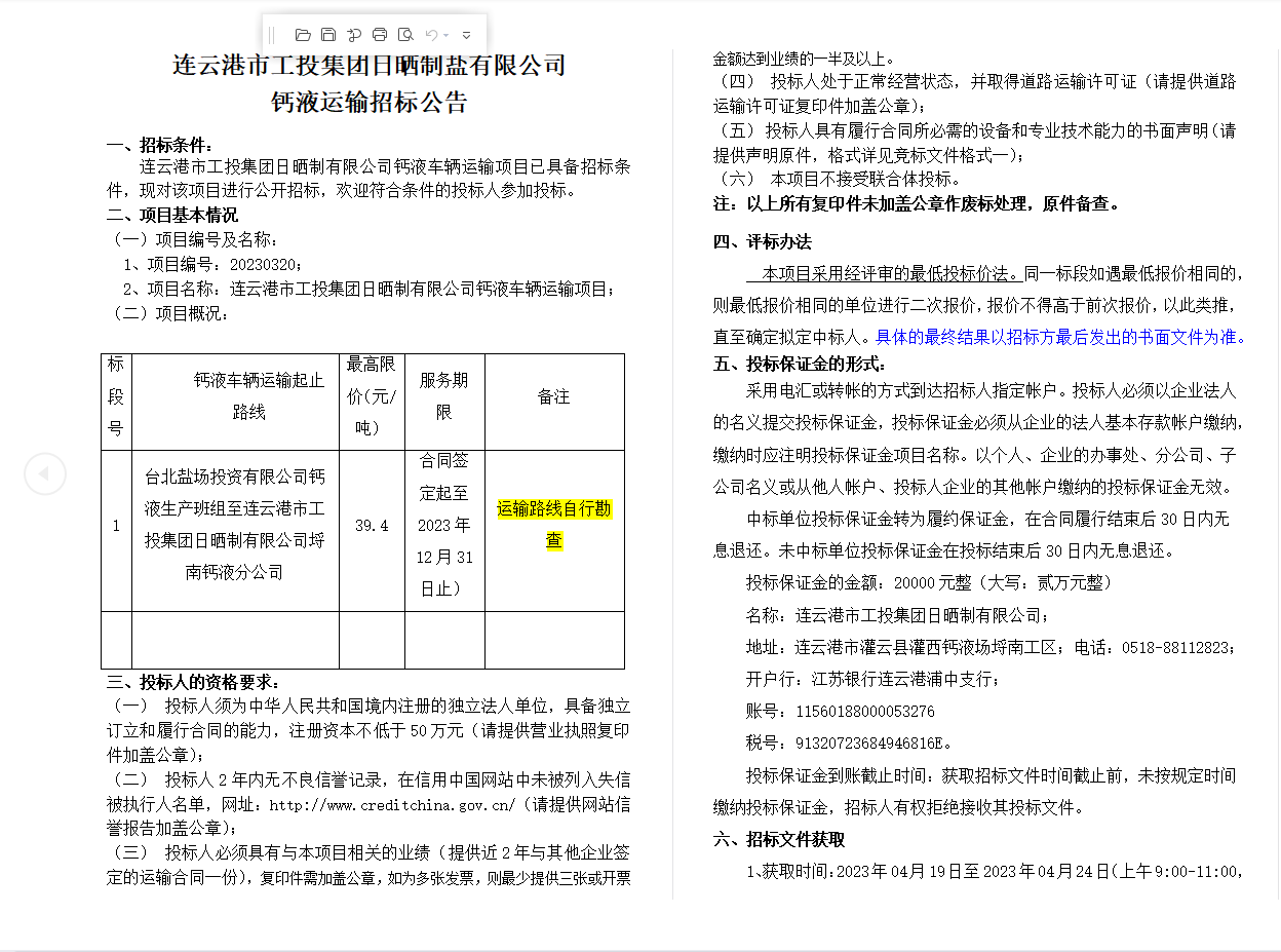連云港市工投集團(tuán)日曬制鹽有限公司鈣液運輸招標(biāo)公告
