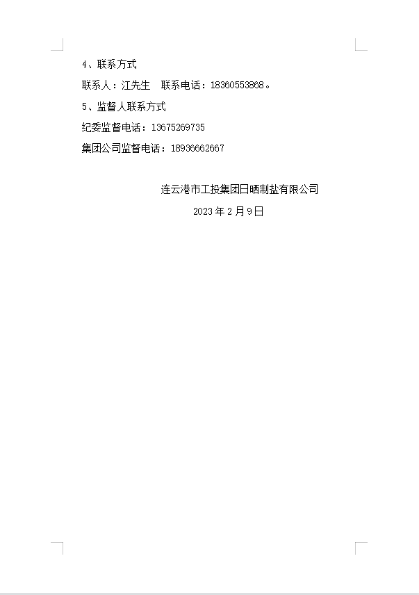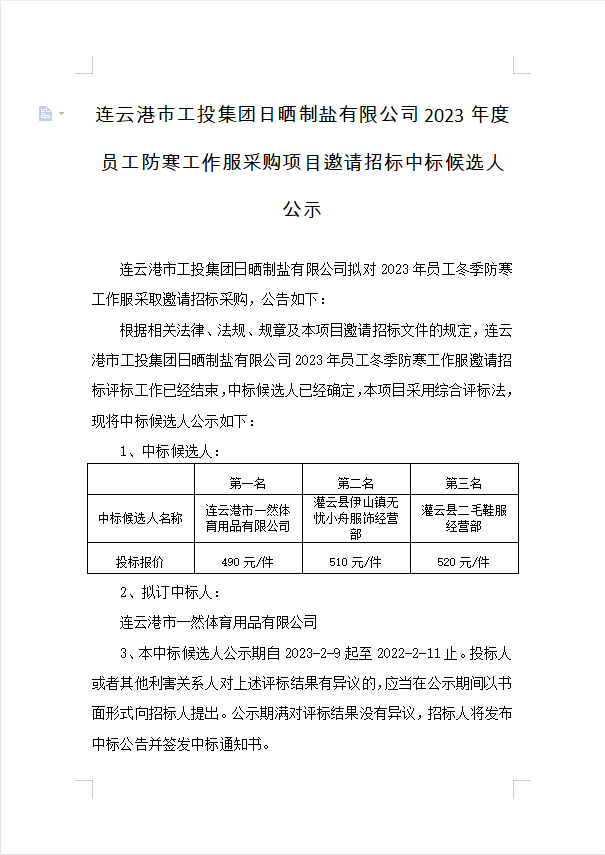 連云港市工投集團(tuán)日曬制鹽有限公司2023年度員工防寒工作服采購項(xiàng)目邀請(qǐng)招標(biāo)中標(biāo)候選人公示