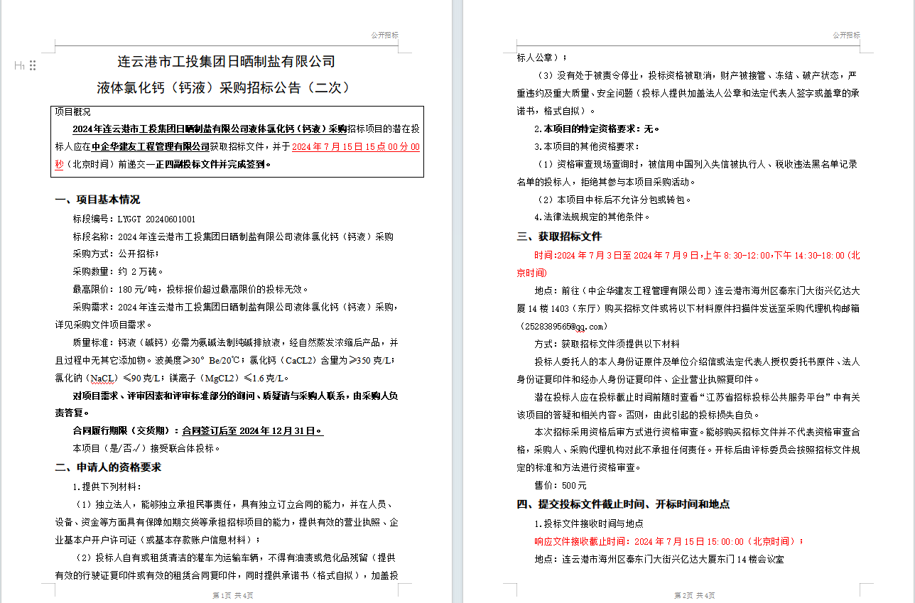 連云港市工投集團日曬制鹽有限公司液體氯化鈣(鈣液)采購招標(biāo)公告(二次)