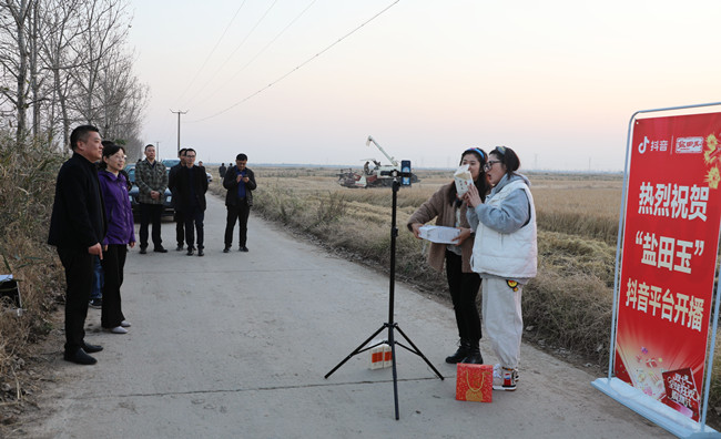 調(diào)研組先后參觀“鹽田玉”抖音帶貨直播間、“鹽田玉”生產(chǎn)加工車間、大新農(nóng)場水稻收割現(xiàn)場。