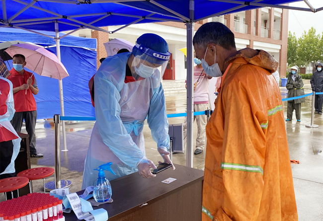 “您好,請出示一下行程碼,做下登記?!眻允卦趰徫?,逆風(fēng)迎雨,對車輛進(jìn)行逐一登記和體溫檢查,絲毫沒有受天氣的影響。
