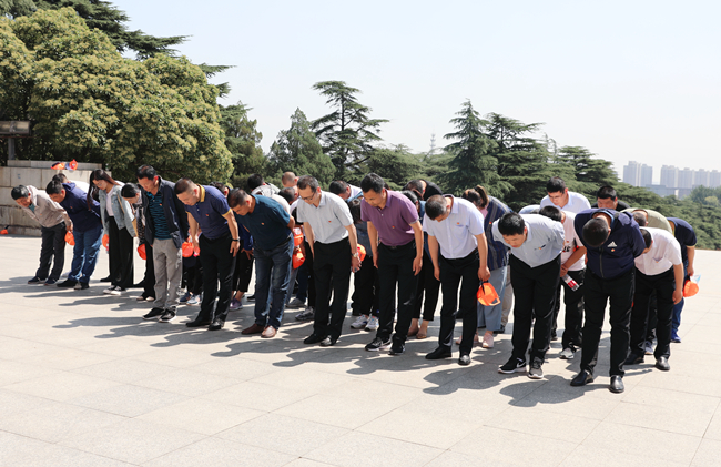 在烈士紀(jì)念塔前,公司黨委副書記梁永帶領(lǐng)全體黨員向淮海戰(zhàn)役烈士敬獻花籃,并三鞠躬。