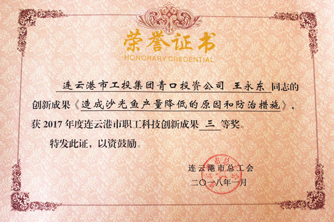 王永東經(jīng)多年摸索研究與實(shí)驗(yàn)總結(jié)出的《造成沙光魚產(chǎn)量降低的原因和防治措施》,曾在《北方水產(chǎn)》上刊登。公司工會收集資料,申報市職工科技創(chuàng)新項(xiàng)目。因該項(xiàng)技術(shù)成熟可靠,對沙光魚各種疾病愈后效果良好而得到認(rèn)可,最終獲得2017年度連云港市職工科技創(chuàng)新成果三等獎。