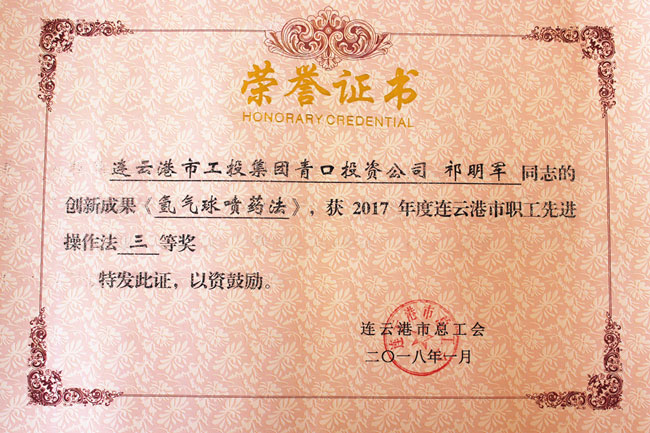 祁明軍的《氫氣球噴藥法》獲得2017年度連云港市職工先進(jìn)操作法三等獎。由他發(fā)明的氫氣球噴藥法,噴藥機(jī)結(jié)構(gòu)簡單,成本低廉,且可靈活調(diào)整,省工省時,霧化效果好。目前該操作法已在青口公司全面推廣使用?!。ㄇ喙ぃ?/span>