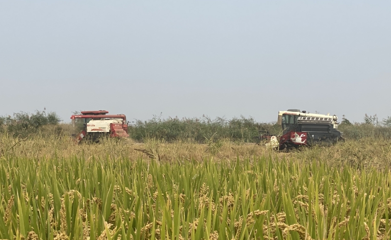 ? ? ? ?10月13日,大新農(nóng)場(chǎng)50余畝稻花香水稻迎來(lái)成熟期,開鐮收割。在金色的稻田里,稻谷隨著秋風(fēng)翻起波浪,空氣中裹挾著稻米的清香。轟隆隆的收割機(jī)來(lái)回穿梭在稻田之中“作畫”,眼前呈現(xiàn)出一派秋收的忙碌景象。(王璐)