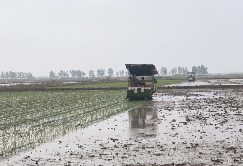 6月4日,大新農(nóng)場搶抓農(nóng)時,全面開始水稻插秧工作,插秧機來回穿梭作業(yè),田間地頭一派忙碌景象。當天,組織插秧機13臺,秧苗轉(zhuǎn)運車6臺次,一天可以完成插秧作業(yè)550余畝。(王 璐)
