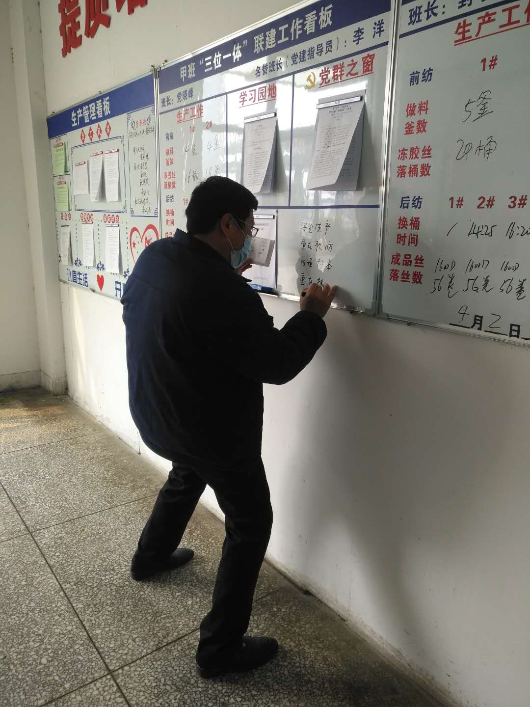 圖為生產(chǎn)設備部副部長王勇為甲班書寫班組口號。