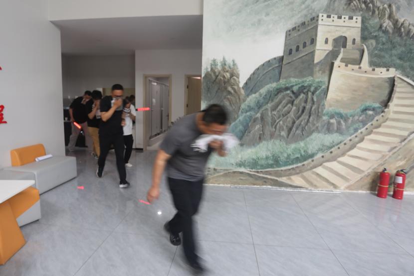 理論培訓結束后,隨即開展了應急疏散演練。公司成立消防應急指揮部,公司黨委書記、董事長王德志作為現場演習總指揮,負責演習現場滅火指揮。滅火行動組、疏散引導組、設備保障組、安全警戒組、醫(yī)療救護組、通訊聯(lián)絡組、信息宣傳組等專業(yè)小組準備就緒,在收到火情報警電話后,第一時間集結各組進行應急任務分配和人員調度啟動應急演練。隨著警報聲響起,辦公樓內全體員工迅速按照預定的疏散路線,捂住口鼻、彎腰低姿,有序地向辦公樓外安全區(qū)域疏散。整個疏散過程緊張有序,演練時長控制在2分鐘以內,有效檢驗了公司應急預案的可行性和員工的應急反應能力。