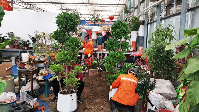2月24日,走進位于振興花卉城的華茂園藝項目部,室外冰天雪地,室內忙碌的身影不斷穿梭……有的在配土上盆、有的在修剪養(yǎng)護、有的在擦洗裝飾,員工們分工協(xié)作、團結一心、有條不紊地進行花卉綠植的入盆及制作,開足馬力增效益。
