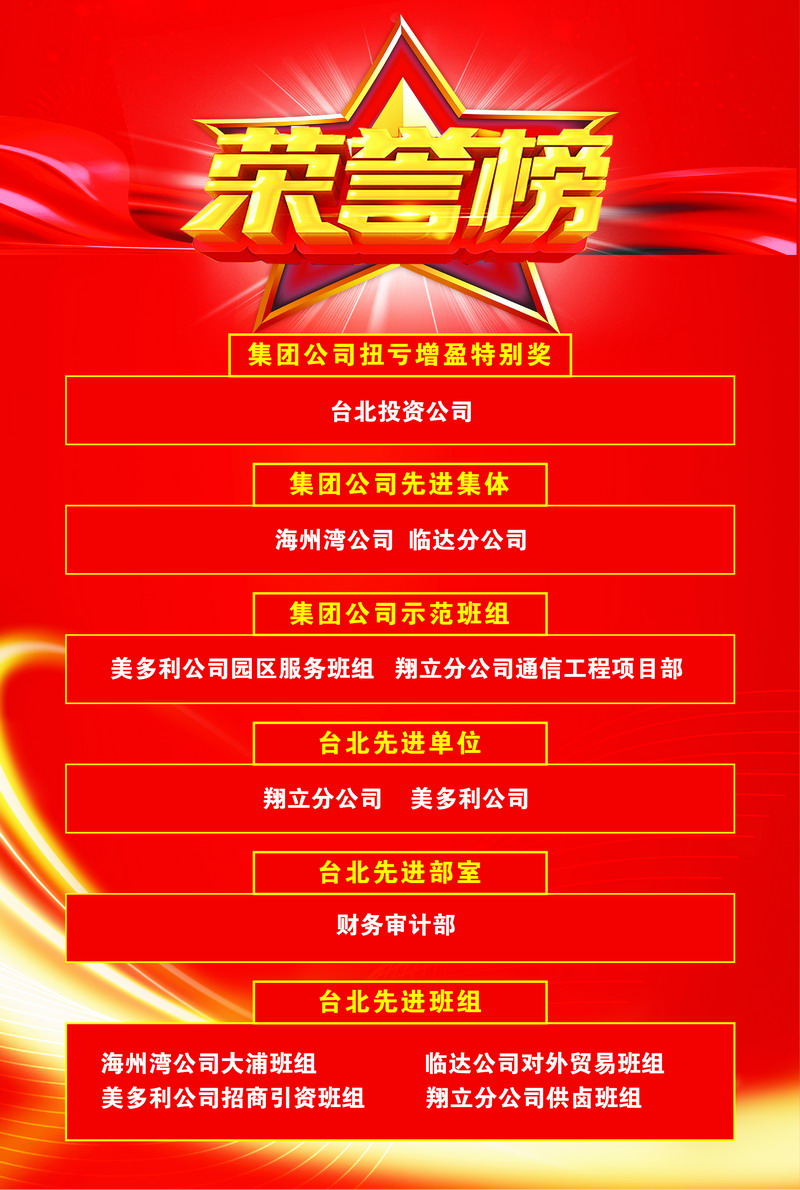 臺北投資公司連續(xù)兩年被集團公司授予“扭虧增盈特別獎”;海州灣公司、臨達分公司被評為先進集體;美多利公司園區(qū)服務班組、翔立分公司通信工程項目部被評為示范班組;夏軍、趙原塵、袁桂誠、宋文靜被評為優(yōu)秀員工。