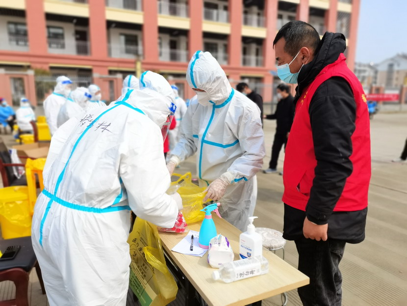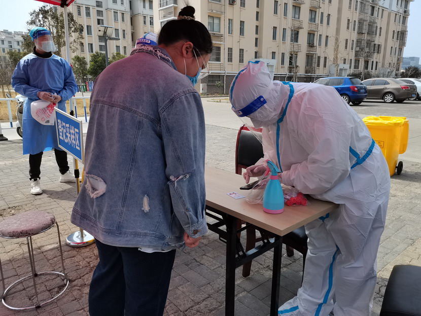 清晨6點(diǎn)30分,1號(hào)檢測(cè)點(diǎn),李明同志在檢查物資,“大白”服裝4套、“小藍(lán)”服裝6套、棉簽600根……;2號(hào)檢測(cè)點(diǎn),于洪亮在將物資上桌,病毒核酸檢測(cè)試管、棉簽、消毒液,“還缺少一瓶酒精,我立即反饋給社區(qū),請(qǐng)社區(qū)抓緊安排送來(lái)”;4號(hào)檢測(cè)點(diǎn),蘇玲、秦黎明正在互相幫忙穿好防護(hù)服,“秦姐,這個(gè)防護(hù)面罩里外有兩層薄膜,我給你撕掉,這樣就不會(huì)有霧氣了”,“嗯嗯,你這個(gè)拉鏈得拉到頂,我們自己也一定要做好防護(hù)”秦黎明溫柔的說(shuō);5號(hào)檢測(cè)點(diǎn),內(nèi)退黨員孫芳和姜海洋,互相在防護(hù)服后背寫上對(duì)方的名字,以便于更高效的完成檢測(cè)工作;6號(hào)檢測(cè)點(diǎn),霍正鋼、朱文健、韓永剛、邱榮濱正在清點(diǎn)檢測(cè)小卡片;7號(hào)檢測(cè)點(diǎn),張強(qiáng)在拿著酒精給廢物處置垃圾箱消毒;8號(hào)檢測(cè)點(diǎn),新加入的孫銀、占恒春、尹永明、韓永光、趙紹慶正在給消殺噴霧劑灌裝84消毒液,社區(qū)8個(gè)檢測(cè)點(diǎn)的消殺工作全部由昌圩臨時(shí)黨支部志愿者負(fù)責(zé)。